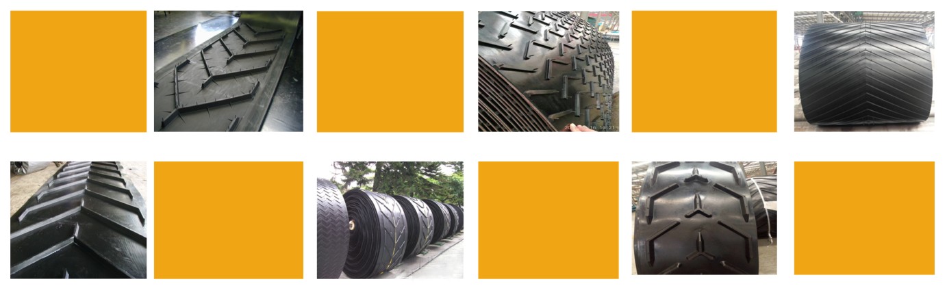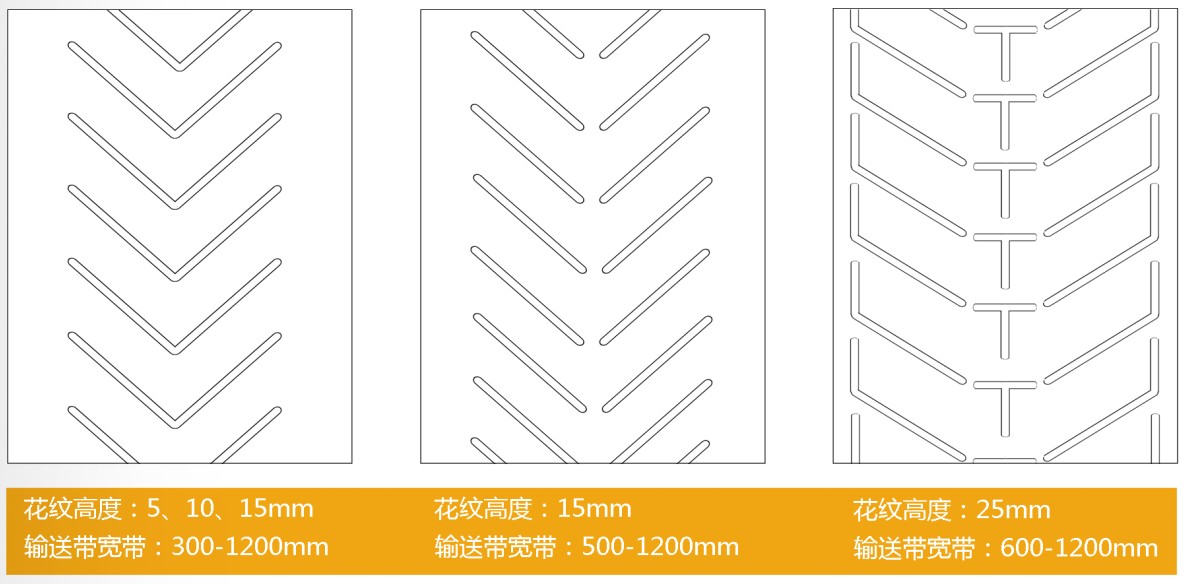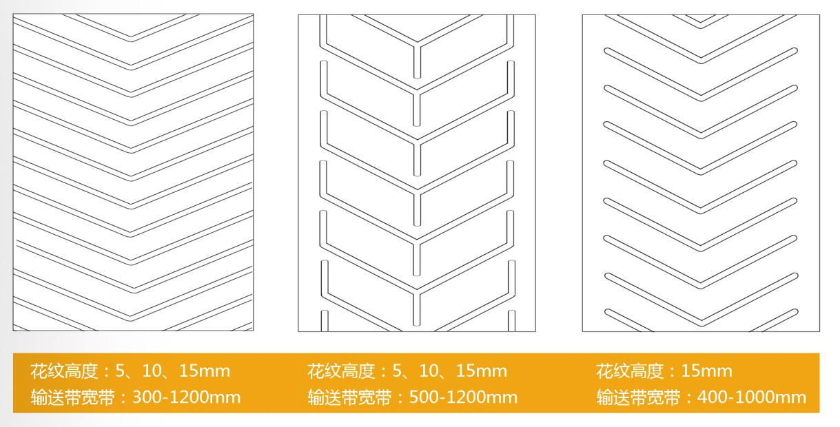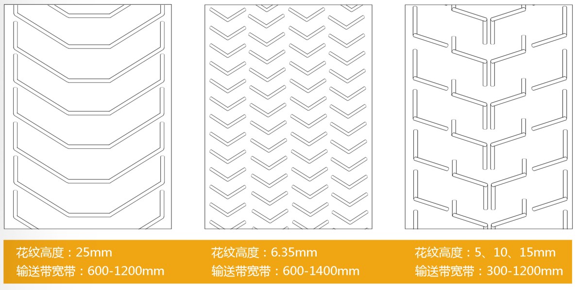 花纹输送带是由工作面为花纹状的覆盖胶和非工作面为平面的覆盖胶与带芯构成的倾角输送带。其主要受力是靠底部基带,表面的花纹只是起到运输货物防滑,或者是一些其它运输上的特殊要求。